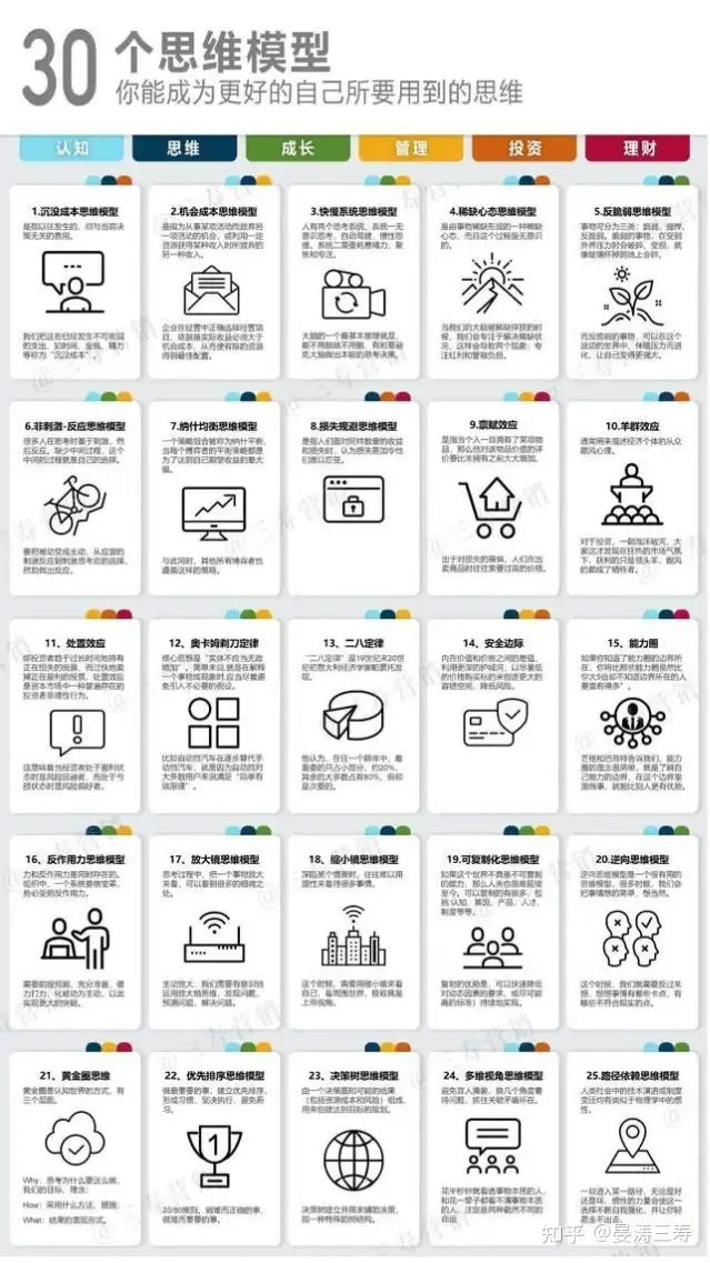 非线性思维方式具有系统辩证思维、发散思维、逆向思维、直觉思维和灵感思维五种基本形式。 95.递弱代偿宇宙138亿年,万物是一系演化的,万物在最底层的那个层面它是同治的,从最早的粒子到后来的原子,后来的分子,后来的单细胞后来的多细胞,一直到人类社会,它是一系演化的,过程当中,它的总规律就是递弱代偿。 世间之物,后衍的物种的生存强度(生存的顽强程度)总是呈现递减态势,一代比一代弱,于是,要想生存下去,就得不断地寻找更多的支持因素,这个支持因素就是“代偿”。 万物演化的方向都是,越来越弱,“生存度”越来越低。但是作为补偿,万物的属性越来越丰富,花样越来越繁多。人类文明也同样在这个规律之中。 貌似越来越强,但是个体依赖性越来越大,总体生存度越来越低。递落代偿模型是一切事物存在、发展、变化、灭亡的规律的终极拷问,可运用从基本的分子结构到微生物结构、低等生物种群、高等动物种群、再到人类社会的演变过程中的推演和预测。 96.耗散结构理论自然万物都趋向从有序到无序,即熵值增加。而生命需要通过不断抵消其生活中产生的正熵,使自己维持在一个稳定而低的熵水平上,生命以负熵为生。 一个典型的耗散结构的形成与维持至少需要具备三个基本条件:一是系统必须是开放系统,孤立系统和封闭系统都不可能产生耗散结构;二是系统必须处于远离平衡的非线性区,在平衡区或平衡区附近都不可能从一种有序走向另一更为高级的有序;三是系统中必须有某些非线性动力学过程,如正、负反馈机制等,正是这种非线性相互作用使得系统内各要素之间产生协同动作和相干效应,从而使得系统从杂乱无章变为井然有序。 生态系统是开放系统,处于远离平衡的非线性区,是一个处于非平衡态的自组织系统,同时具有非线性的动力学过程。因此生态系统是一个具有耗散结构功能的系统。 97.复杂自适应系统复杂自适应理论(CAS)是指系统中个体能够与环境中的其他个体进行交流,在这种交流的过程中“学习”,或“积累经验”不断进行演化学习,并且根据学到的经验改变自身的结构和行为方式。 各个底层个体通过相互间的互交和交流,可以在上一层次和整体层次上突显出新的结构、现象和更为复杂的行为,如新层次的产生,分化和多样性的出现,新聚合的形成,更大个体的出现等。每一个复杂适应系统都有四个方面的主要特征: 基于适应性主体共同演化趋向混沌的边缘产生涌现现象:最为本质的特征是由小到大、由简入繁 98.路径依赖人类社会中的技术演进或制度变迁均有类似于物理学中的惯性。一旦进入某一路径,无论是好还是坏,就会沿着该路径一直发展下去,并锁定在该路径上,惯性的力量会使这一选择不断自我强化,并让你轻易走不出去。 积极的路径依赖,好的路径依赖,对企业起到正反馈的作用。通过惯性和冲力,产生所谓的飞轮效应,企业发展,从此进入良性循环。 消极的路径依赖,不好的路径会对企业起到负反馈的作用,通过惯性和冲力产生泥沼效应,使企业发展从此进入恶性循环。 如何突破路径依赖?学:时刻保持学习的状态,时刻准备着向更高的方向迈进。新:革新理念,居安思危。聪明睿智的企业家都善于居安思危,未雨绸缪,危机感让他们能够坚持不懈的努力。舍:敢于放弃沉没成本。创:创新开拓,另辟蹊径。 99.自催化模型商业世界的模型都能在自然世界中找到源头,自我催化模型来自于化学中的「自催化」现象。「催化剂」是化学里面一个神奇的物质,只需要一点点就能将反应速度加快几十几百倍。自催化就是在反应过程中就能生成这种让反应加速的催化剂。 作为一种典型的思维模式,芒格说的这种[自我催化]模型是很令人启发的。现在这个世界变化的越来越快,我们总是看到类似生产马鞭子的公司不断被新技术、新服务颠覆,然而却有这么一种[被世界抬着前进]的模型, 即新技术、新服务的出现,不仅不能颠覆它,反而能够为其所用,助推它运行得更有效。这自然是商业经营和投资中的完美典型,如迪士尼,亚马逊的飞轮效应等。 迪士尼最重要的是做好一件事:制作电影。电影不但能够产生巨额收入,还能够形成广泛的影响力和知名度,电影被观看次数越多,这个电影的 IP 就越经典。这使迪士尼乐园、电影衍生品、IP授权等其他业务也都能获益。 更重要的是,这个模式是互相催化的。消费者越喜欢迪士尼乐园、购买电影衍生品,就越愿意观看迪士尼制作的电影。用系统理论来解释就是,迪士尼构建了一个自我强化的增强回路。 100.第一性原理两千多年前, 亚里士多德对于第一性原理是这样表述的:「在每一系统的探索中,存在第一原理,是一个最基本的命题或假设,不能被省略或删除,也不能被违反。」 第一性原理包含几个层面的含义: 1) 回归到本源、本质,独立思考。2) 从本源、本质上进行推导,而不是用类比的方法进行判断。 简单来说运用了第一性原理作为思考的框架:就是打破一切知识的藩篱,回归到事物本源去思考基础性的问题,在不参照经验或其它的情况下,从物质/世界的最本源出发思考事物/系统。 譬如物理学的第一性原理:万物皆由原子构成的 这个基本定理 囊括了宇宙万物一切物质的构造,任何产品都可以无限分解为最基本的单元,直至问题解决为止,最基本部分又恰好是构成整体的基础,所以任何